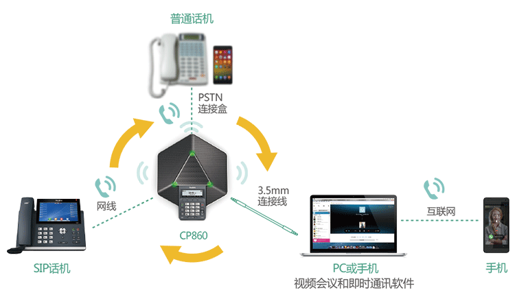 通過3.5mm連接線連接PC/手機,CP860秒變外接式會議電話,適用于各種視頻會議和即時通訊軟件,免驅動設計,即插即用