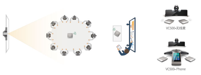億聯VC500-無線麥版本:配備2個無線麥克風,長達10米的傳輸距離,穩定可靠,可在整個會議室中靈活移動使用,保障最優會議效果,同時使會議桌面更簡潔