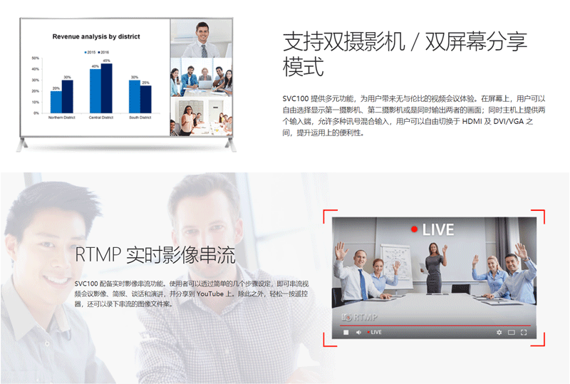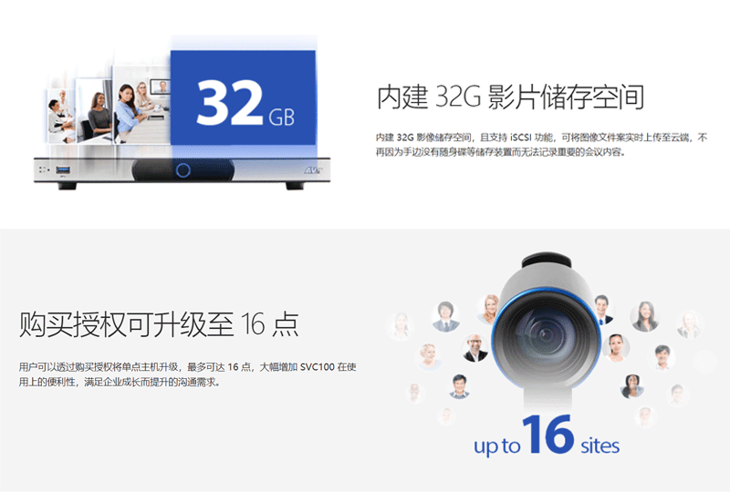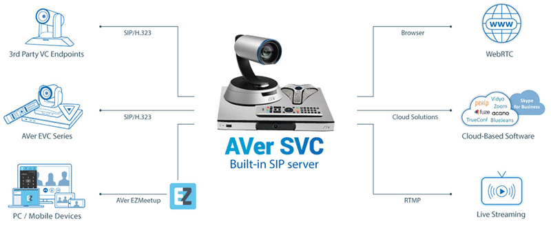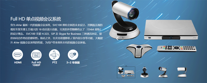 SVC100 可以接收和分享實時影像或是簡報檔案等內容。除了和 Skype for Business 完美結合外,同時也支持 H.323 和 SIP 兩種通訊傳輸協議,大幅增加系統兼容性,為協同合作帶來更多可能。