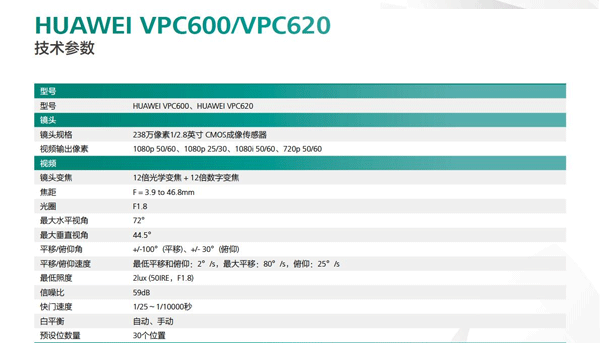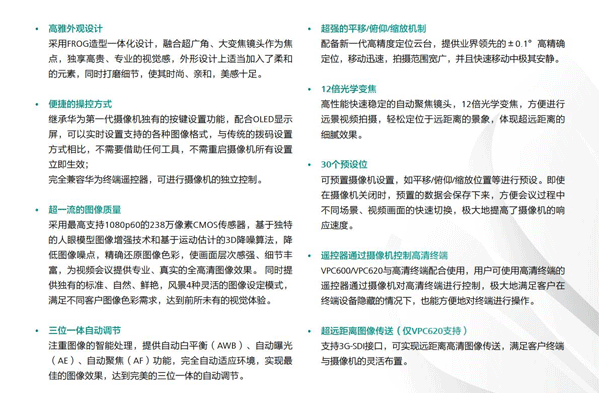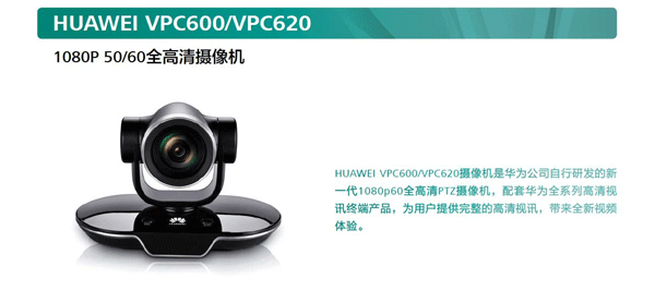 VPC600系列高清攝像機是新一代1080p60全高清PTZ攝像機,支持12倍光學變焦以及72°廣角,配套華為全系列高清視訊終端產品,為用戶提供完整的高清視訊,帶來全新視頻體驗。