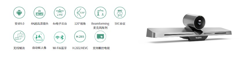 VC210定位于小微型會議室,采用4K超清鏡頭,120°超大水平視角,同時采用H.265/HEVC視頻編解碼,可實現4K30超高清視頻通話,可抵抗30%的視頻丟包。內置6個Beamforming陣列麥克風,結合全新音頻算法,支持定向拾音,智能消噪技術,讓5米范圍內的發言者聲音更加清楚。與億聯云視訊服務深度集成,用戶可輕松實現一鍵入會。采用六合一的一體化設計,集成編解碼器、攝像機、麥克風、掛架、Wi-Fi、藍牙,支持無線輔流,支持觸控電視,只需要兩根線材即可完成部署。